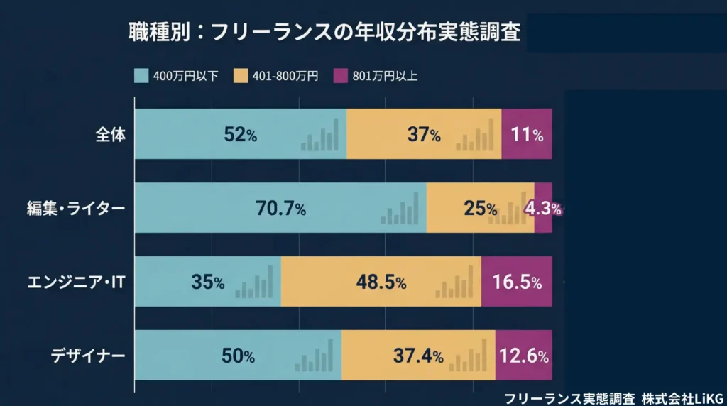 フリーランス全体の過半数が年収400万円以下という厳しい現実の背景には、生成AIの台頭による“代替可能性”の差が影響し始めていると考えられます 。定型的な制作業務ほど価格圧力を受けやすく、AIを単なる脅威として排除するのではなく、活用して付加価値を高められる層との格差は、今後さらに拡大することが予想されます 。