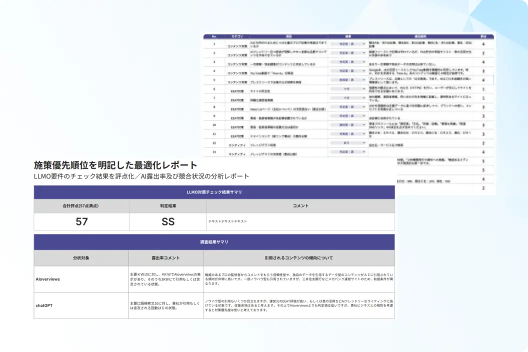 AI検索における自社サイトの「健康状態」を、独自の20項目(コンテンツ、E-E-A-T、エンティティ、テクニカル)に基づき詳細に診断。AloverviewsやChatGPTにおける現在の露出状況を調査・スコアリングし、優先的に取り組むべき課題と改善策を可視化したレポートをご提供します。感覚的な対策ではなく、データに基づいた戦略立案が可能です。